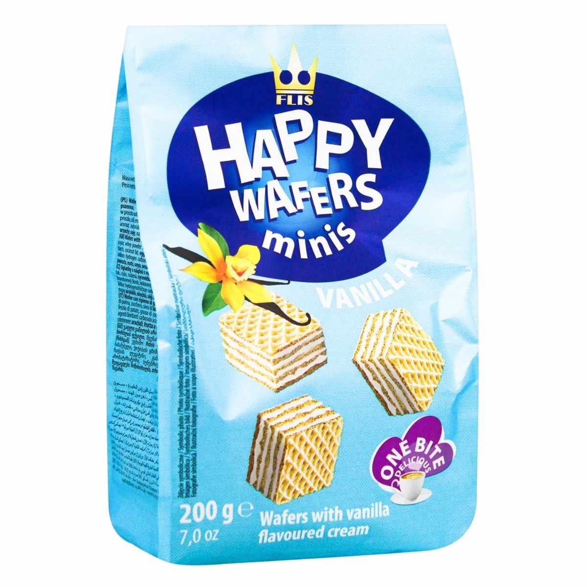 Experience delightful moments with Flis Happy Wafers Minis, filled with smooth vanilla-flavored cream. These bite-sized treats offer a perfect balance of crispy wafer and creamy sweetness, ideal for satisfying your snack cravings anytime. Conveniently packaged in a 200g bag, they’re perfect for sharing or enjoying on the go. Indulge in a timeless classic that brings joy with every bite.