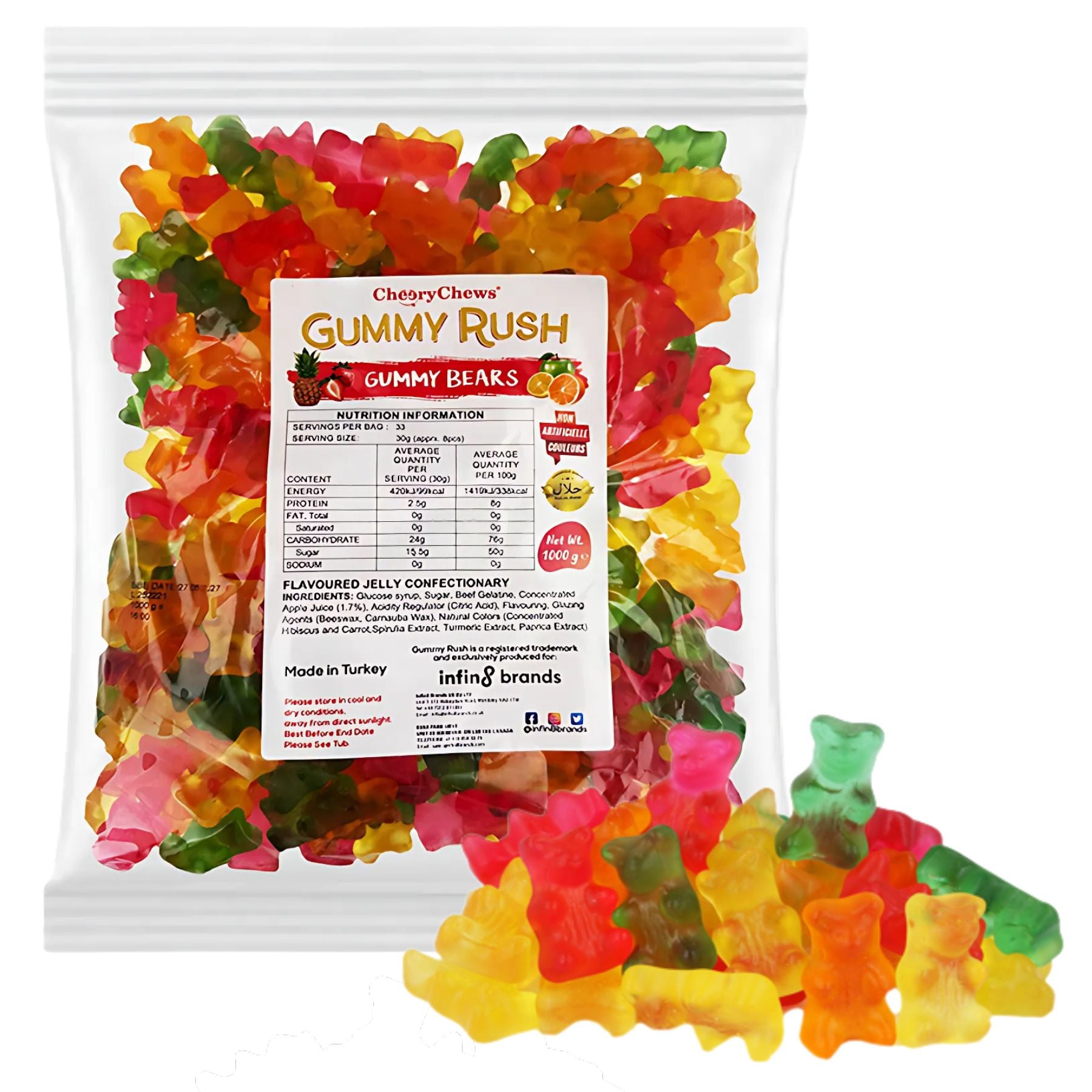 Indulge in the delightful taste of Gummy Rush Halal Gummy Bears, packed in a generous 1kg bag. These colourful, chewy treats offer a fun and satisfying snack that meets halal standards, perfect for sharing or enjoying anytime. Whether as a party treat, a sweet reward, or a flavourful pick-me-up, these gummy bears bring joy with every bite.