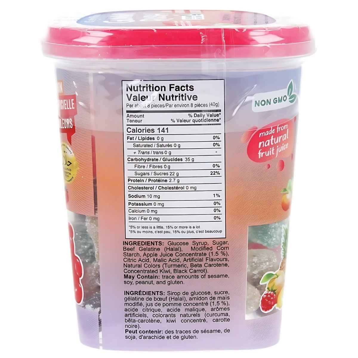Glucose syrup, sugar, beef gelatine (halal), modified corn starch, apple juice concentrate (1.5%), citric acid, malic acid, artificial flavours, natural colours (turmeric, beta carotene, concentrated kiwi, black carrot). May contain: trace amounts of sesame, soy, peanut and gluten.