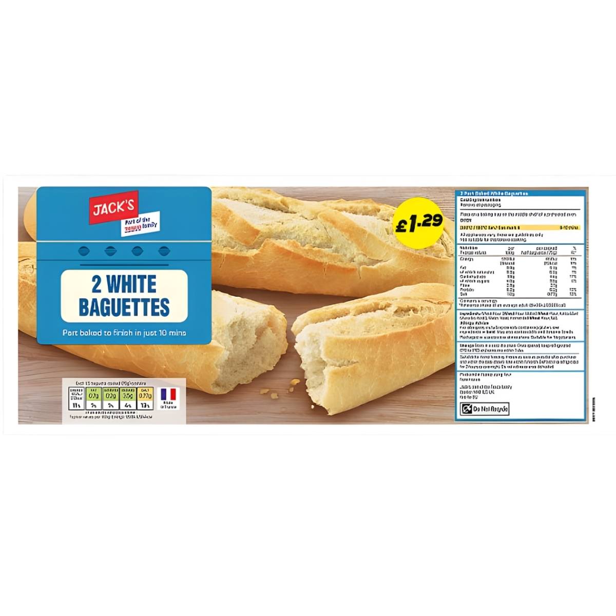 Jack's part-baked white baguettes deliver authentic French-style bread with the convenience you crave. Simply finish baking these premium baguettes at home to enjoy that irresistible golden crust and soft, airy crumb whenever you want. Perfect for weeknight dinners, entertaining guests, or satisfying fresh bread cravings without the wait. Each pack contains two baguettes, ideal for families or sharing. Experience bakery-quality results in minutes—the taste of freshly baked bread, made effortless.
