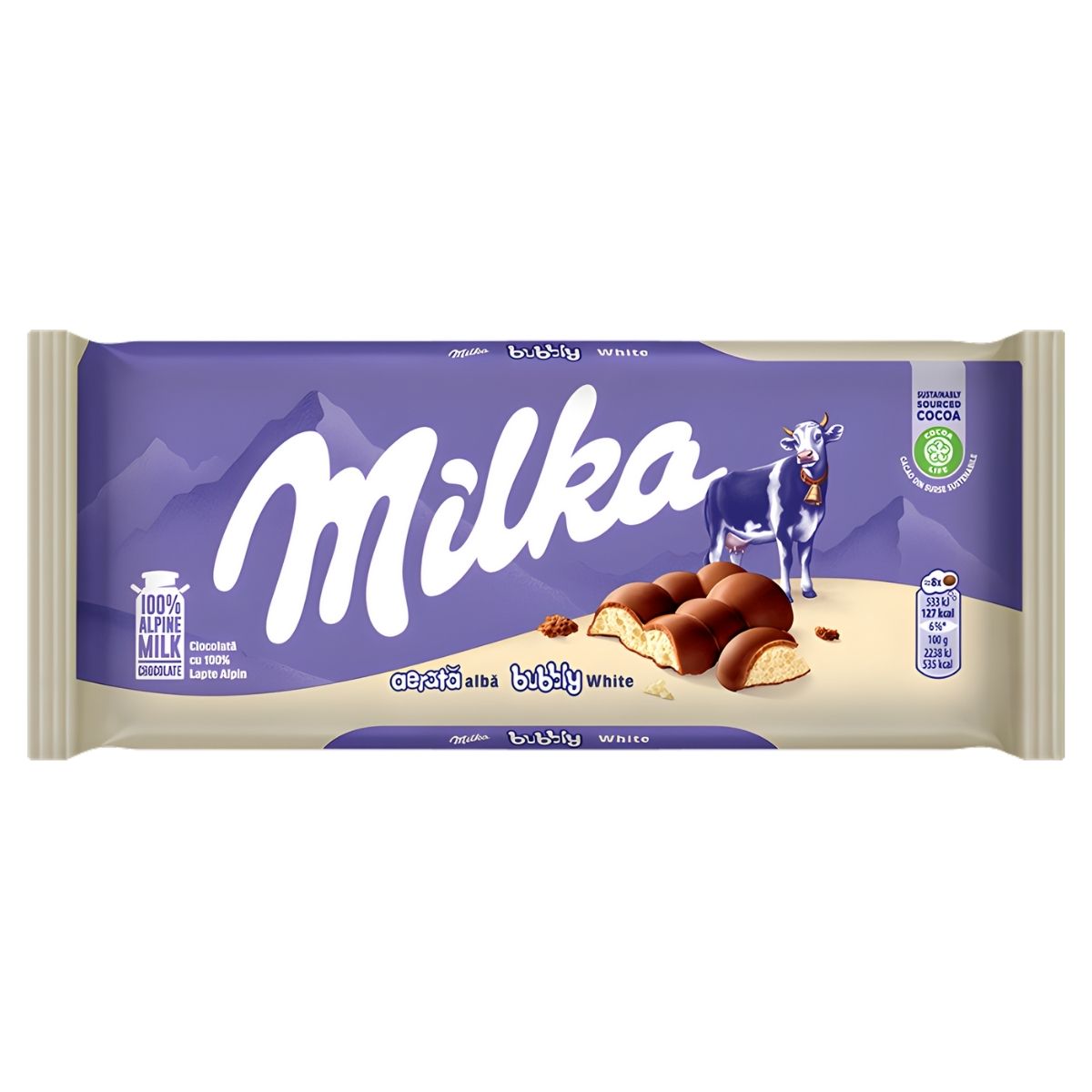Indulge in the irresistible lightness of Milka's Bubbly White Chocolate Bar. This 95g treat combines smooth Alpine milk chocolate with delightfully aerated white chocolate filling, creating an exceptionally creamy texture that melts on your tongue. At 46% cocoa content, it strikes the perfect balance between rich chocolate flavour and airy indulgence. Ideal for those moments when you crave something special—whether as a personal treat or a gift for chocolate lovers who appreciate quality confectionery. Experience the distinctive taste of Alpine milk chocolate in every satisfying bite.