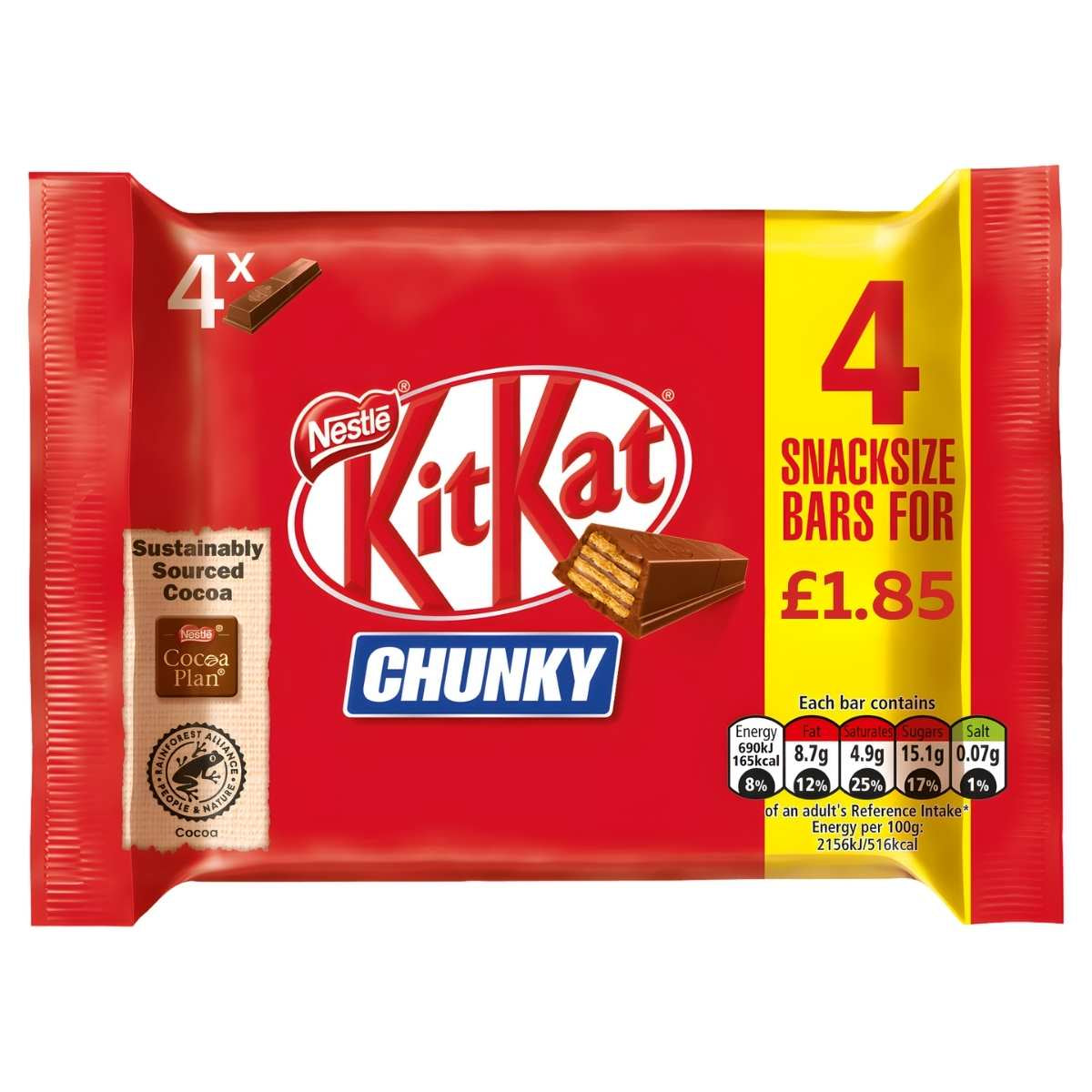Enjoy the perfect balance of crunch and creaminess with Nestle Chunky KitKat. Four crispy wafer fingers are generously coated in 70% rich milk chocolate, delivering a satisfying texture and indulgent flavour in every bite. Ideal for a quick treat or sharing, this pack offers a deliciously convenient way to brighten your day.