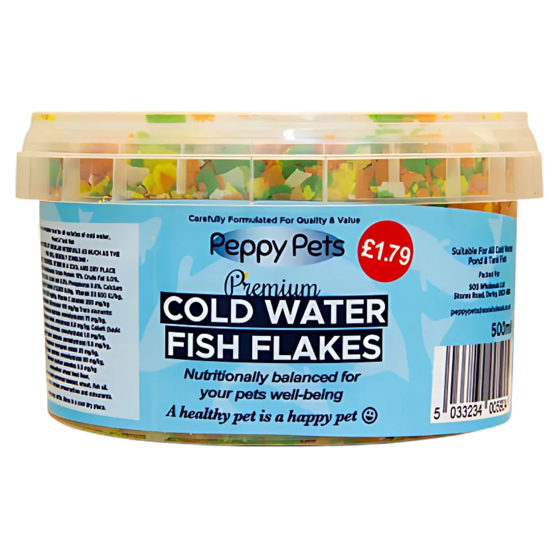 Peppy Pets Cold Water Fish Flakes provide a balanced and nutritious diet specifically formulated for cold water fish. This 500ml pack ensures your aquatic pets receive essential vitamins and minerals for vibrant colours and healthy growth. Easy to digest and suitable for everyday feeding, these flakes support overall fish vitality and well-being, making your tank a lively and thriving aquatic environment.