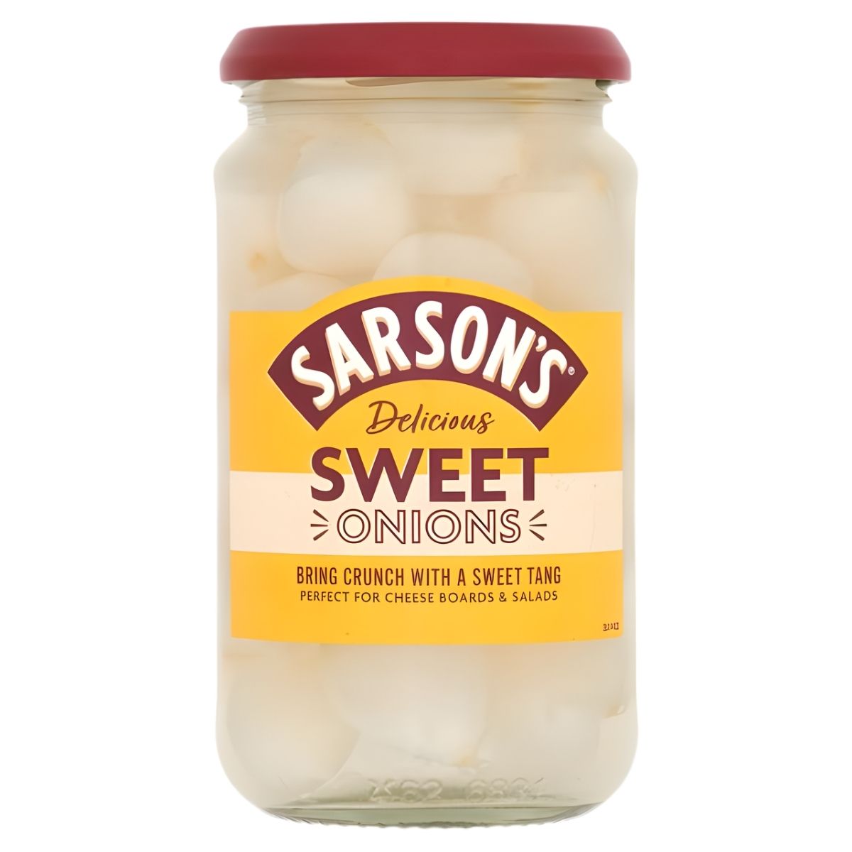 Sarson's Sweet Onions offer a delightful balance of tangy and sweet, carefully pickled in a mild vinegar with just the right touch of sugar and sweetener. These 460g silver skin onions add a burst of flavour to sandwiches, salads, and charcuterie boards, enhancing your meals with their crisp texture and irresistible taste. Perfect for elevating everyday dishes, Sarson’s Sweet Onions bring a convenient, tasty twist to your kitchen essentials.