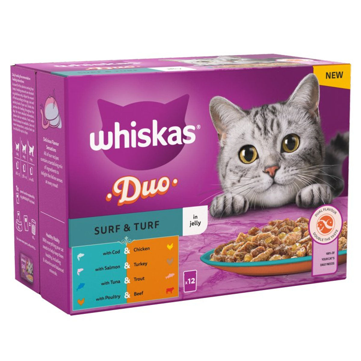 Treat your adult cat to the delicious taste of Whiskas 1+ Duo Surf and Turf, combining succulent fish and tender meat in a savoury jelly. Each convenient 85g pouch delivers complete nutrition tailored for cats aged one year and above, ensuring a balanced diet with essential vitamins and minerals. The irresistible dual-flavour formula keeps mealtimes exciting, while the easy-to-serve pouches make feeding effortless. With 12 pouches per pack, you'll have variety on hand throughout the month. Give your feline friend the quality nutrition and flavour satisfaction they deserve with every meal.
