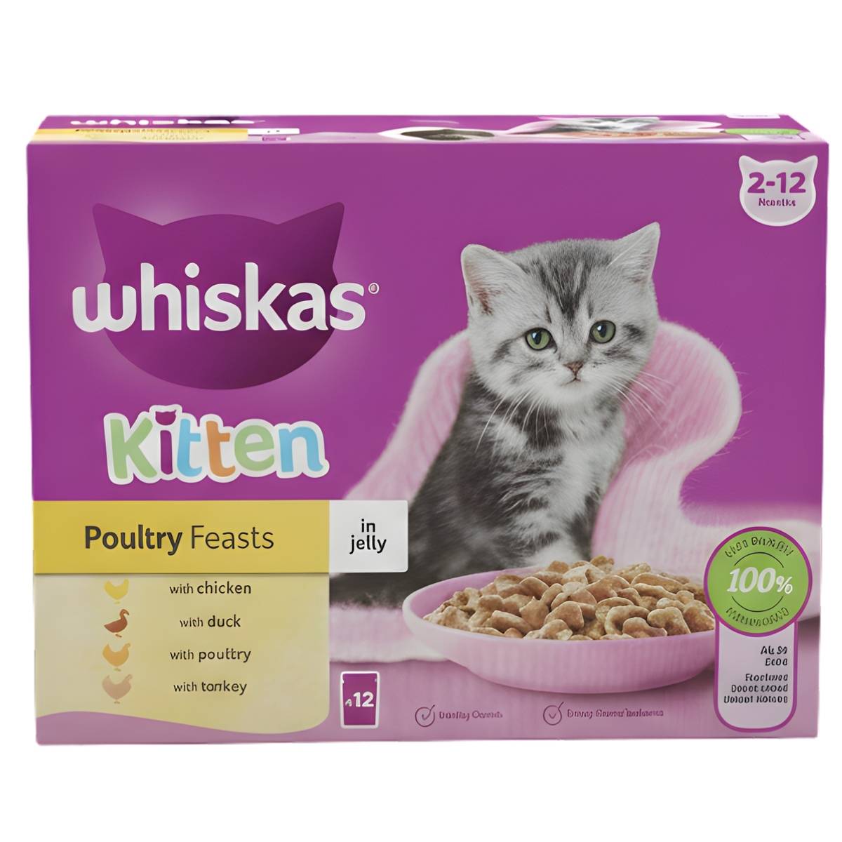 Nourish your growing kitten with Whiskas Poultry Feasts, specially formulated for kittens aged 2-12 months. Each convenient pouch delivers a delicious blend of poultry in savoury jelly, packed with essential nutrients to support healthy development and energy levels during this crucial growth stage. The soft, palatable texture is perfect for young cats, encouraging healthy eating habits. With 12 pouches of 85g each, you'll have a month's supply of complete nutrition your kitten will love. Trust Whiskas to give your kitten the balanced diet she needs to thrive.